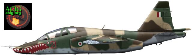 Yamoussoukro AB, Cote d'Ivoire, November 2004: Some of the most colorful African combat aircraft ever were the two Su-25UBs in service with the Forces Aériennes Cote d'Ivoire (FACI) - until badly damaged and written off in an attack of French special troops and attack helicopters against Yamoussoukro AB, on 6 November 2004. The aircraft depicted here, "Red 21", is unusual for FACI then it carries no civilian registration - as all FACI aircraft and helicopters previously, regardless of their purpose. The French attack in which it was destroyed came in retaliation for a strike flown by this and the other Ivorian Su-25UB ("Red 20") on a UN-Peacekeepers base near Buake, in which nine French Marines were killed. |