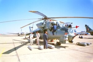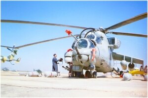 A pilot hands over a helmet and it's mounted sight to the gunner. IAF Mi-35s underwent an extensive upgrade in Israel, mainly to enhance their night fighting capabilities. The associated gyro stabilized turret holding a FLIR, CCD camera and laser rangefinder, can be seen on the starboard side of the chin. The aircraft's self-defense suite and cockpit environment have also been taken to the next generation. In the distance, one can just about make out the only American aircraft to participate in the event - a lone Bell 407+.