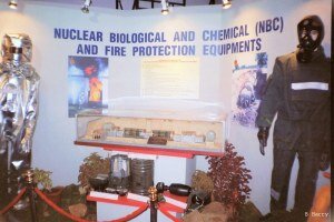 Various locally developed NBC and Fire protection equipment. The model shows an NBC shelter with a decontamination unit. It can accomodate 13 occupants for 9 days.