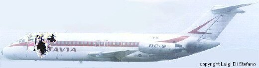 Reconstruction of the damage caused to the DC-9 by possible hits of two AAMs. After examining the wreckage of the aircraft, British and Swedish investigators opposed the theory according to which the it was shot down by AAMs, and instead concluded that most probable reason for the catastrophe was a bomb placed in the toilette at the rear of the aircraft. (Luigi di Stefano) |