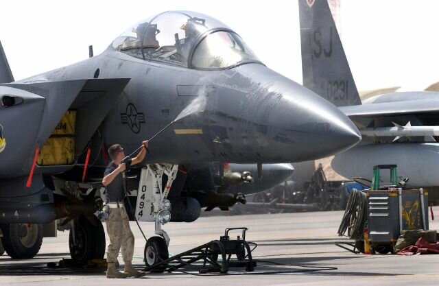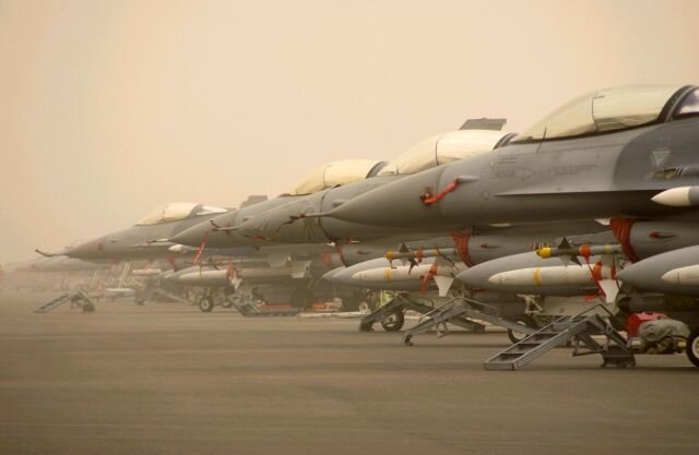 | Row of USAF F-16CGs as seen parked on an Iraqi airfield hit by sand-storm, during operation "Iraqi Freedom", in March 2003. (Photo: USAF) |