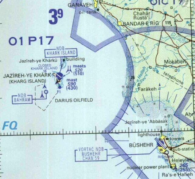 | Tactical pilotage chart of the Bushehr area, showing the Khark Island in north-east, the Bushehr airfield (IRIAF's TFB.6), and the position of the building site of the first two Iranian nuclear reactors. Although much is being said about a possible Israeli strike against this reactor, closer analysis reveals that such an operation would make very little sence, then the most important Iranian nuclear facitilies - especially those that could be brought in connection with potential nuclear weapons program - are positioned deep inside Iran, mainly between Tehran and Esfahan. (Tom Cooper collection) |
