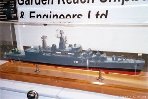 Kora class missile corvette designed and manufactured by Garden Reach Shipbuilders and Engineers (GRSE) Ltd. of Calcutta. The small 1,350 tonne corvette packs a massive surface to surface punch with 16 Zvezda 3M24E Uran AsHMs. Currently, these corvettes carry MATCH (Multi Role Anti Submarine Torpedo Carrying Helicopter) Chetak helicopters for the ASW role but are soon to be equipped with the naval Dhruv helicopter which will replace the former. Naval Dhruvs will carry the DRDO (LRDE) SV-2000 Maritime patrol radar.