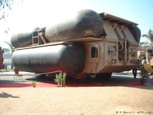 This 42 tonne mammoth is an Amphibious Floating Bridge and Ferry System (AFFS) developed by the R&DE (Engrs) branch of DRDO, for the ferry of traffic across large and deep water obstacles. The 10 x 3.6 x 4 m vehicle can covert to a fully decked bridge configuration of length 28.4 m, in 9 minutes. Two more vehicles can be joined in tandem to form a floating bridge of length 105 m, in 30 minutes. The bridge superstructure is integrated with floats (shown inflated) to provide stability and additional buoyancy.