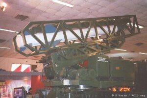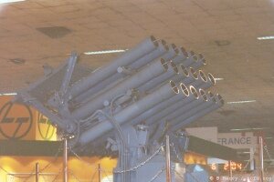 A 1:8 scale model and a full size mockup of the WM-18 Naval Rocket Launcher, built by L&T. This weapon system is for use aboard Landing Ship Tank (LST) warships to facilitate beach clearing operations. The whole system comprises of port and starboard launchers capable of firing 18 rockets in single launch or salvo mode. The electro-hydraulically operated launchers are slaved to a Director designation sight and controlled from a remote console. A two axis servo stabilized system compensates for ship roll and pitch motion.