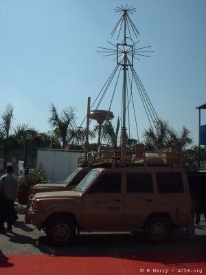 The Sujav is a compact EW system for the V/UHF communication range, seen installed on TATA 'Sumo' 4x4 vehicles. It can perform a fast spectral search between frequencies of 30 to 1000 MHZ with 4 channel monitoring and jam on multiple frequencies with responsive jamming being used against fixed and frequency hopping sets. Jammer power output is 500 W(VHF) / 200 W(UHF) and features decoding of standard formats and direction finding with emitter location being fixed on a map. This system has been designed by the DLRL lab of DRDO, the designers of the 'Tempest' EW system.