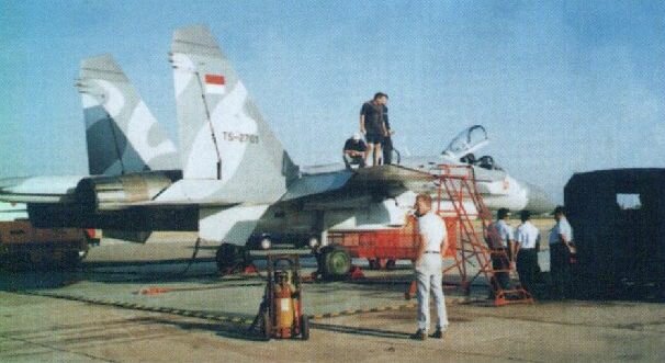 | After being put together and inspected by a team of Russian technicians, the Su-27SK "TS-2701" is seen while being readied for the first flight. (Photo: Pentak Iswahjudi) |