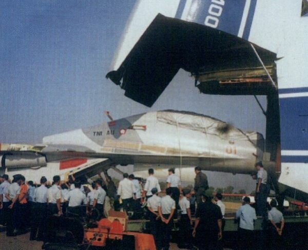 | The first two Su-27SKs and two Su-30s for the TNI-AU arrived aboard the Antonov transports directly from Russia. The Su-30 serialled "TS-3001" is seen here during the unloading process. (Photo: Serka Eko Edi/Dispen AU) |